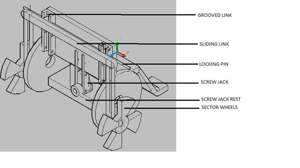 From the standard dimensions of the wheel chair and the stair case a new wheel was designed. The designed wheel had four sectors which would enable the wheelchair to climb the stair. The designed wheels were attached to a system which would slide along a grooved link.The grooved link was designed prior to this and a mechanism for locking the system at the required position was also designed. This mechanism was simulated using ADAMS for checking the feasibility.