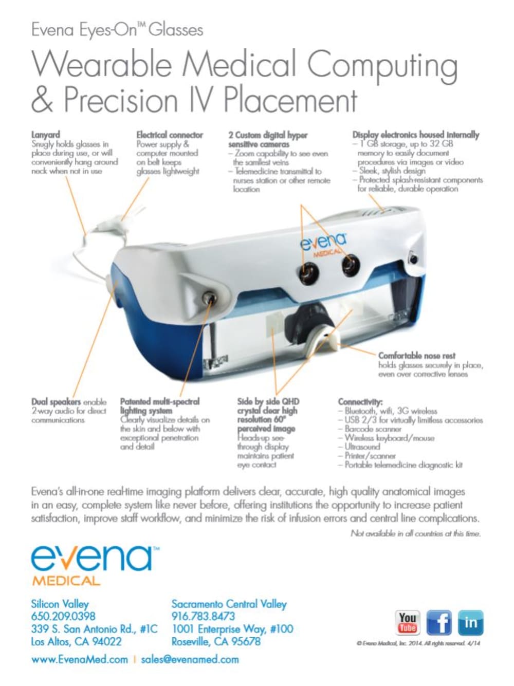 The first wearable computing system for vascular imaging and informatics convergence. The newest addition to the Evena Medical family of products is the one-of-a-kind point-of-care wearable Eyes-OnTM Glasses imaging system. Evena’s Eyes-On Glasses not only provide hands-free, cart-free imaging for vascular access, but unprecedented connectivity to hospital information systems and patient records, data storage, plus remote information sharing. The Evena Glasses system is appropriate for pre-hospital, physician offices, clinics or hospitals. The Glasses unit is battery powered and offers the ultimate in portability and ease of use.