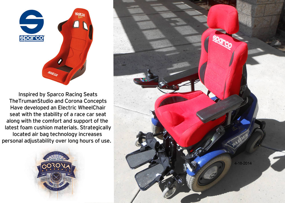Design Direction and Prototype - I contacted Gabriel Corona, founder of Corona Concepts, to create the seat cushion into a similar Sparco racing style. The partnership between TheTrumanStudio and Corona Concepts resulted in the new electric wheelchair seat cushion product.