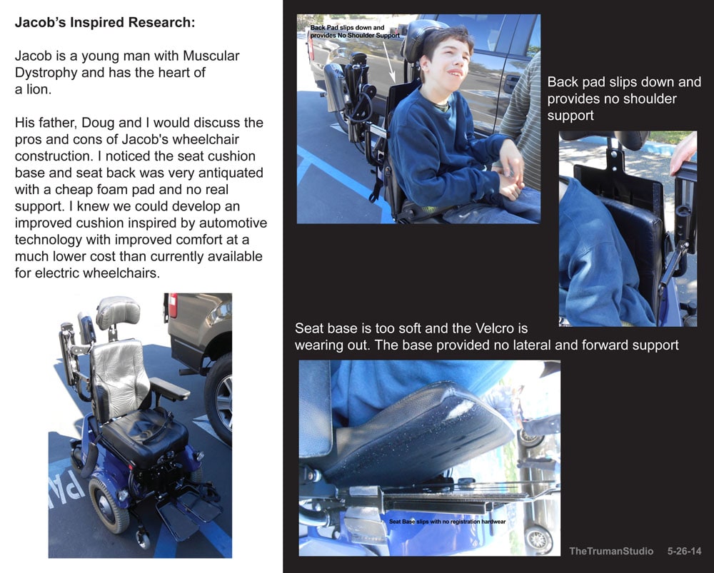 Jacob Inspired - Jacob is a young man with Muscular Dystrophy and has the heart of a lion. His family is a prime example of power wheel chair consumers. His father Doug is a software engineer who would discuss the pros and cons of Jacob's wheelchair construction. I noticed the seat cushion base and seat back was a very antiquated and cheap foam pad. I knew we could develop an improved cushion inspired by automotive technology with improved comfort at a much lower cost than currently available for electric wheelchairs.