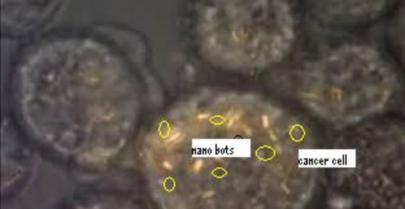 Cancer cell have a higher temperature than the body temperature. The nano bots carrying the cancer treatment drug will be temperature sensing bots, which when coming into contact with the cancer cell will open up and pour the drug directly into the cancer affected cells.