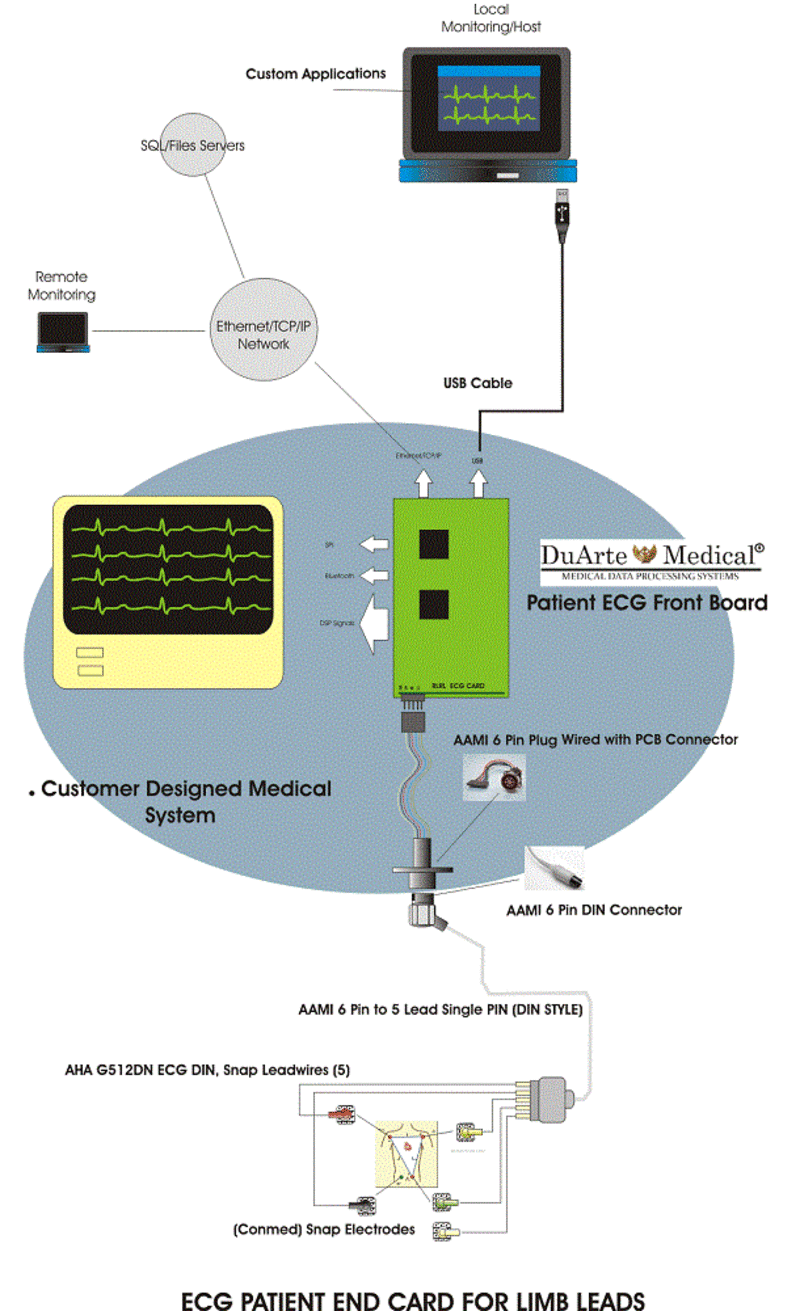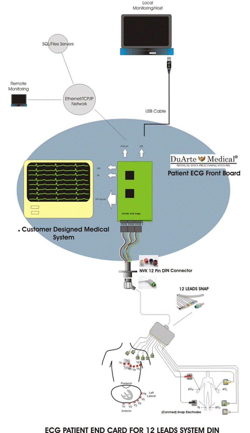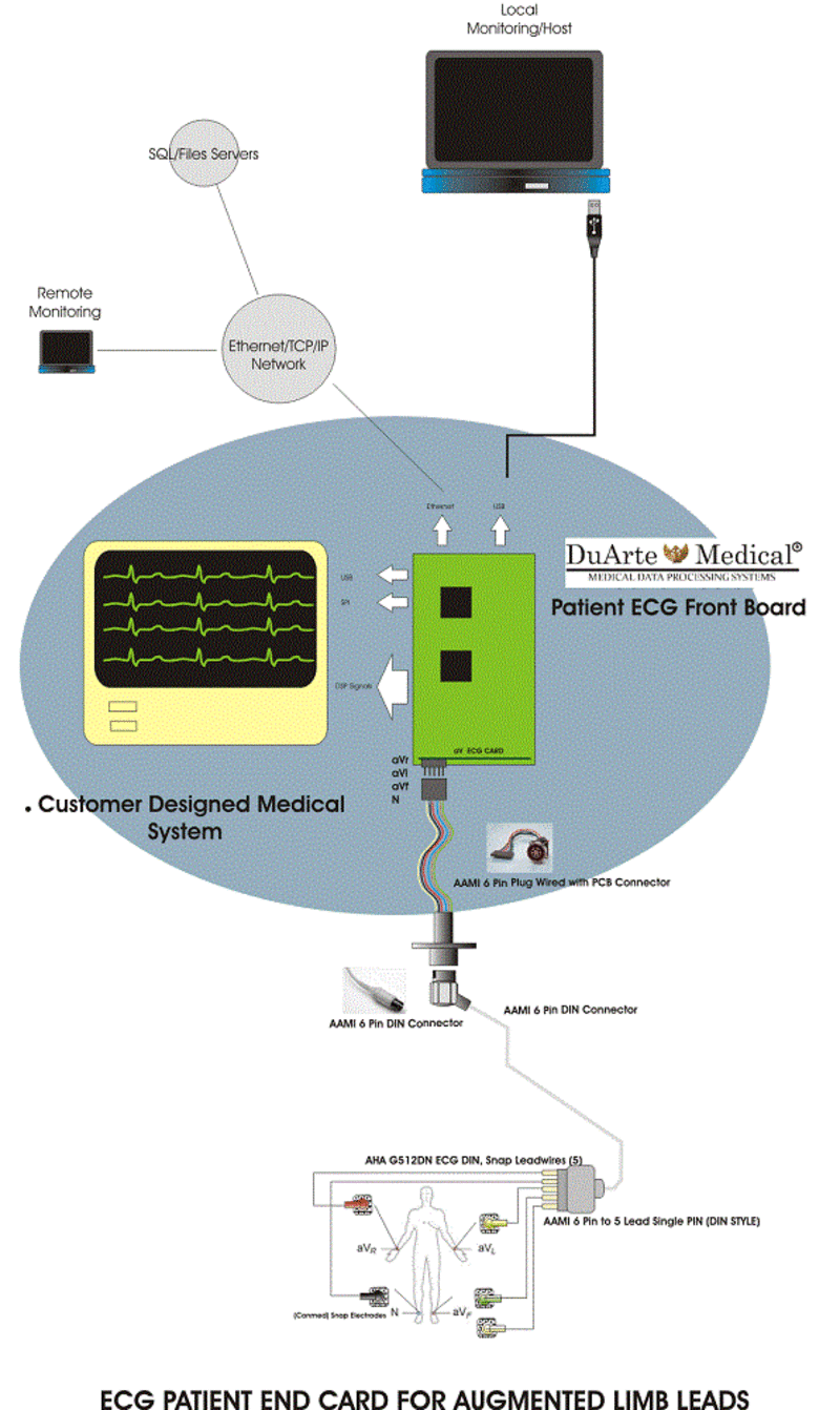 The boards consist in all the required patient isolation and defibrillation protection systems for the ECG leads. Includes certain optional “Right Leg Drive” circuitry. There are several models in the product line. Limbs Leads Systems, Augmented Lead, 12 Leads Systems (DIN and D-Sub).