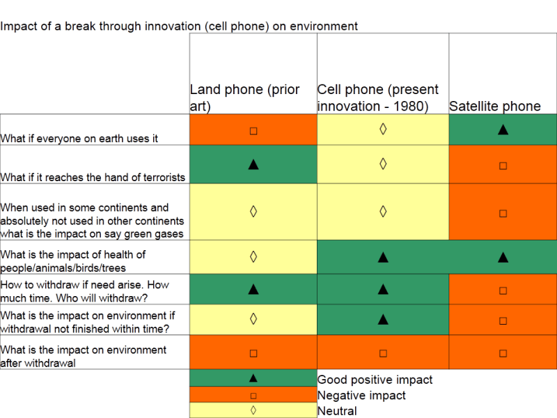 The ENV model makes use of probing questions, selected for domains. E.g., what is the effect on the environment if the product is used by everyone on Earth? Past (prior art), present and future directions are subjected to the same questions. Three levels of evaluation are utilized in ENV. Viz. Red for damaging to environment, Green for good for environment, and yellow for neutral or cannot say. Evaluation is done by the inventing team, witnessing team as well as evaluating team. ENV model is to be applied after achieving GO from evaluating an innovation from the business angle. After applying ENV if the result is RED, innovation needs to be redesigned or to be dropped altogether for the sake of the environment and future generations.