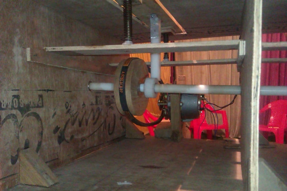 This mechanism converts the impulse energy produced by the passing of the vehicle over a speed bump into the linear motion of the rack, attached to the speed breaker, which drives a pinion mounted on shaft with the help of one way bearing. The shaft rotates only in the locking direction of the bearing, which in turn rotates the pulley mounted on it. The restoring springs push back the speed breakers to their equilibrium state. The pulley drives the alternator rotor through a V-belt. The alternator used is a low inertia compoundly excited DC alternator, that is, it requires batteries to generate field current. The batteries are connected to the alternator, which get charged when the alternator rotor rotates.