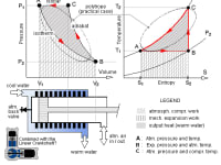 In practice however, the cylinder simply gets hot, heat being cooled off all the time, and so the process doesn't follow the ideal isotherm-adiabat-isobar lines of the diagrams, but instead something along the oval (polytropic) path as shown. During the expansion strokes, some air will leak over the piston seals into the cylinder, so a back-valve is needed at the cylinder top, to prevent the end-pressure to exceed the atmospheric one. To keep piston friction, and by that the machine size down, a linear crankshaft can be used as shown (my "re-invention", patented already decades before I was born - US 2166975). I made a model and it worked!