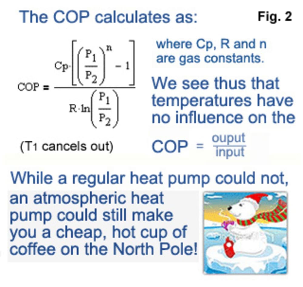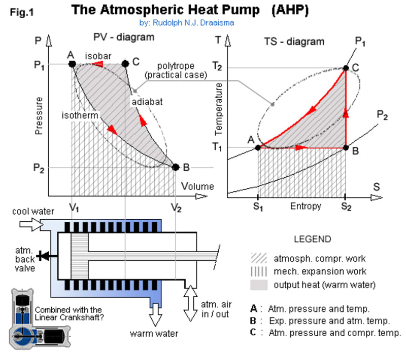 In Fig.1, the piston initially is in position (A), enclosing trapped air in volume (V1) at atmospheric pressure (P1) and ambient temperature (T1). When the piston then is drawn out to position (B), the air's volume expands to (V2) at a lower pressure (P2), but its temperature doesn't change, because the air didn't do any work - we did work on the atmosphere instead. Next, the atmosphere recompresses the air, moving the piston to position (C), while doing work on the air, thus causing it to get hot (T2), but is still not at the end of its stroke. From this point, where the atmosphere did as much work as we did, any further motion of the piston would require us to do additional work, BUT, by cooling off heat, the trapped air's volume decreases, tending to lower its pressure, so the atmosphere can continue to drive the piston to end of stroke, back to position (A), thus closing the cycle (ABC). The extra work that the atmosphere does from (C) to (A) is our surplus, more than we had to put in from (A) to (B) and it comes from the surroundings, solar heat, stored in the atmosphere. It's the same for regular heat pumps, just that they create a lower temperature with CFCs, while the AHP creates a lower pressure instead with air only - can it be more environmental friendly?