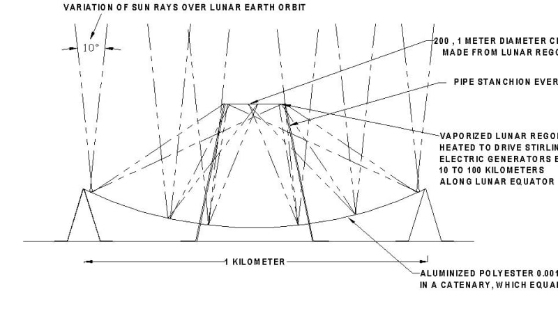 My proposal, defined in detail in a 37 slide Power Point presentation, Chapter 1 in my book, “Solutions”, and is also available on my Facebook page, or on request, would build a solar power station on the moon in ten years in which concentrated solar thermal energy obtained from parabolic concentrators (shown below) fabricated from lunar materials is converted to electricity by Stirling Cycle generators invented and developed in the 19th century and operating in current solar systems in California.