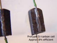 The advantage of this system is as follows: There is no saw loss of silicon. (That loss is about 50%) The amount of silicon in a cell is about 0.004"-0.006", which is about 1/2 the normal amount. The energy required is about 20% of normal. The cells themselves are very robust versus easily breakable like todays conventionally made silicon cells.