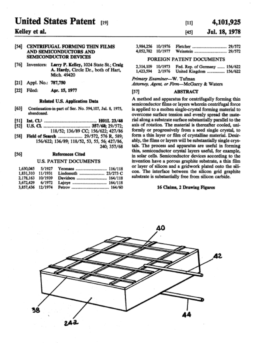 The method involves a centrifuge that is able to run efficiently at the melting point of silicon. The size of the centrifuge is about 12" in diameter and approximately 15" in length. It spins at fairly low speeds on a horizontal axis. The centrifuge is heated from the inside with a moveable carbon based heater. It runs in a near vacuum. A carbon 'boat' measuring about 1.1" wide x 13" long by about 0.010" thick with part of the middle of the strip milled out to a depth of about 0.007". Some molten Silicon is deposited into the 'cavity' where it immediately hardened and grip the carbon strip tightly. The Si/C strip is loaded into slots in the inner portion of the outer skin of the centrifuge. Then a vacuum is drawn and the heat and rotation is turned on. The silicon melts and due to the centrifugal force, the surface tension is broken and the silicon spreads over the milled out surface of the carbon. Due to the low temperature, no SiC is formed at the interface. The heating element is withdrawn and crystal growth proceeds lengthwise resulting in fairly large single crystal grains. Then the temperature is lowered quickly and the vacuum is released. The silicon /carbon strip is shuttled into a phosphorus diffusion chamber where the junction is formed. Then the edges of the silicon carbon strip is machined off so that the junction is not shorted out. Then, collector strips are deposited onto the top surface and the carbon acts as the bottom collector.