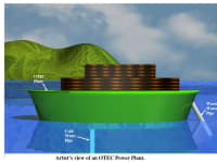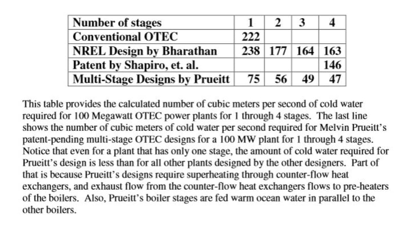 A conventional 100 MW OTEC plant requires about 222 cubic meters of cold water/second to be pumped up to the OTEC plant. That requires huge pipes and lots of power. Recently a new OTEC design was filed for a patent application, and it required only 146 cubic meters of cold water per second. And then I applied for a patent on my revolutionary design that will require only 49 cubic meters of cold water per second to produce 100 MW of power. This opens the door to the possibility of building many OTEC plants that can produce electricity cheaper than coal-fired plants.