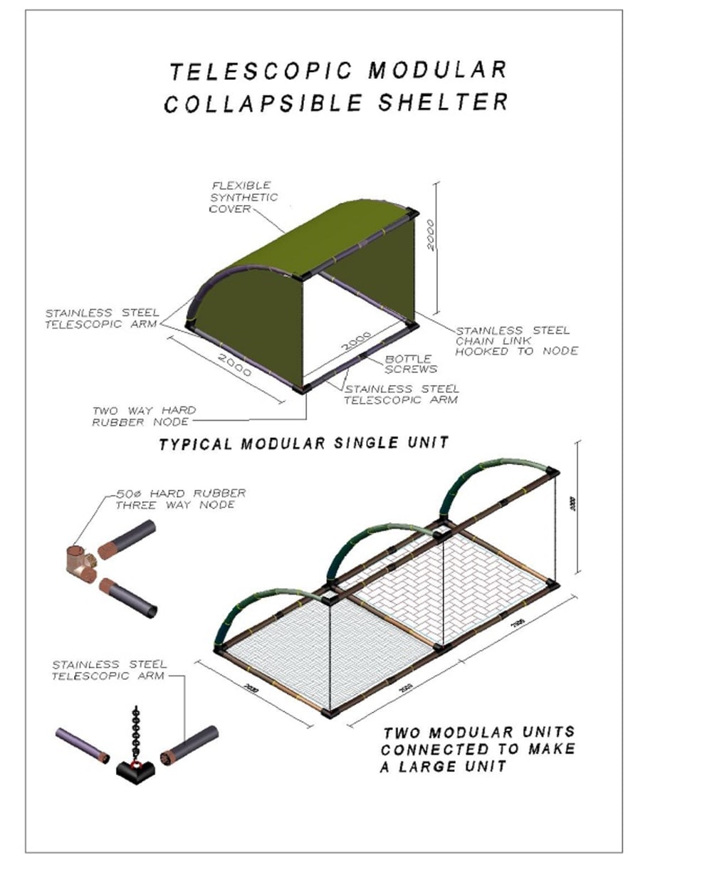 Telescopic Collapsible Shelter (TCS) provides a practical and simple cost effective solution to the above problems. Standard Modular TCS units 2000 x 2000 x 2000 in size will consist of detachable Stainless Steel Telescopic members. These members will be connected with the help of Nodes made of hard rubber and Bottle screws as shown in the drawing. The main frame after erection will have to be anchored to make it stable against strong wind. Once the frame is in position TCS can be covered by flexible synthetic or other suitable light weight, durable covering sheet.