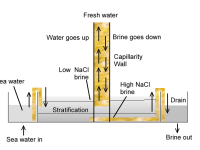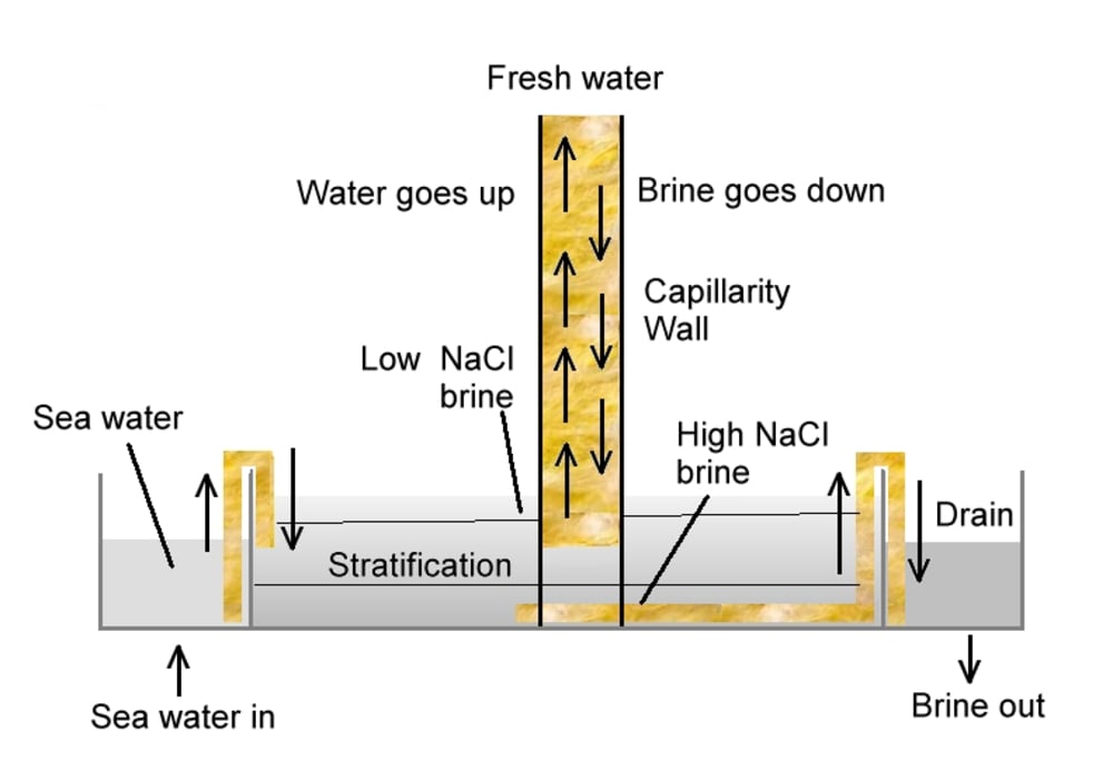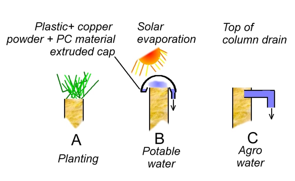 In the second graphic there are some ideas to use the Capillarity Siphon scheme for cultivation, making suitable agro water (low in NaCl, there are crops that can deal with that) or use Sun energy to make it potable by a Black collector(plastic) intermixed with a heat conductor (i.e. imbed copper powder or iron or use the fiber system to...plant seeds.