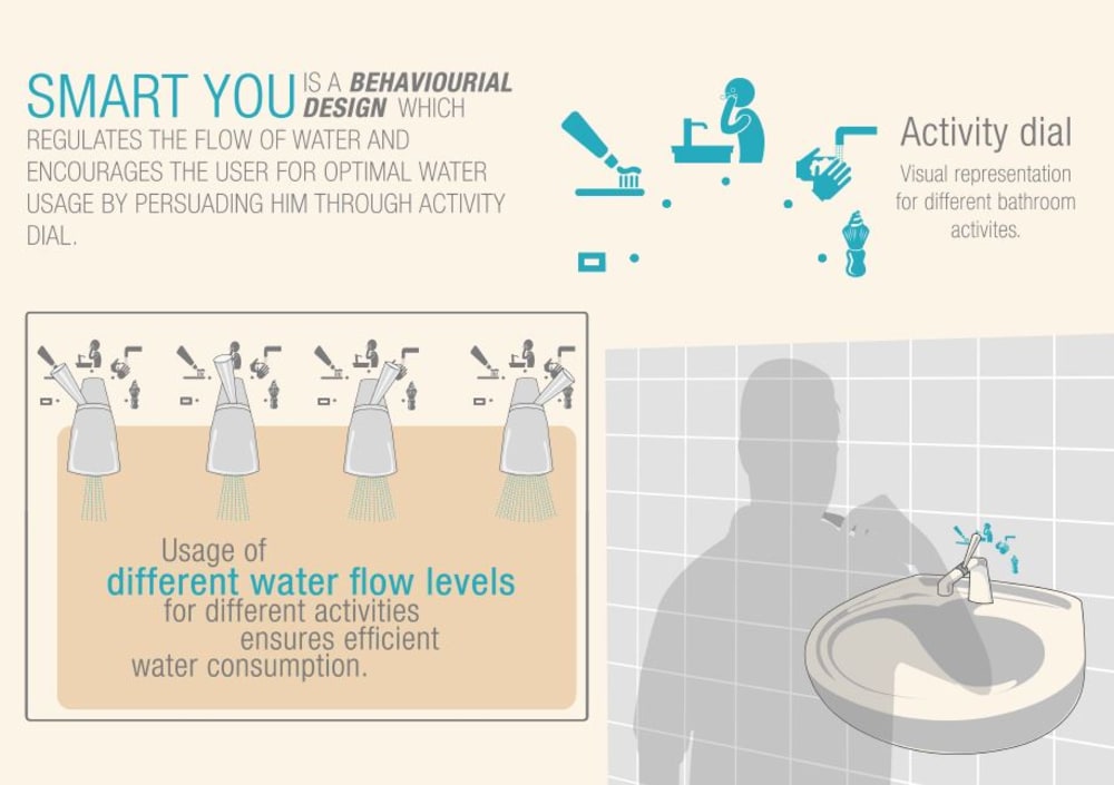 Urban dwellers don’t pay much attention to their everyday water usage in the bathroom activities such as brushing, face wash, hand wash and shaving. ‘SMART YOU,’ a product comprised of a tap and activity dial, is a persuasive behavioral design to make the user aware of his water consumption for the various activities. The awareness may lead to positive behavior in the user causing less water wastage.