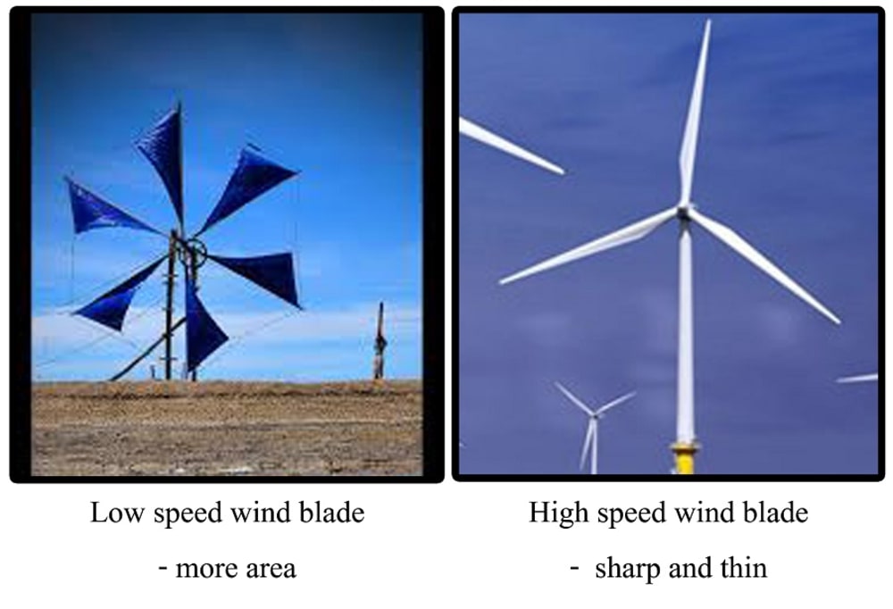At high wind speed, wind turbine blade is sharp and thin. On the other hand, at low wind speed the blade is long and more area.