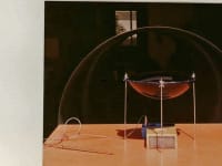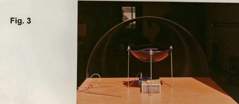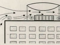 Aerodynamic Testing - Ejector driven 48" diameter blow-down tunnel employing compressed air from adjacent project represented wind over the model (Fig. 3). Condenser model was a 3"x6"x9" box using steel wool as resistance of the cooling coils. The aerodynamic disks of 15" diameter with maximum thickness of 4" and 8" were vacuum molded, with attachment points. Flow visualization employed TiCL4 dispersed by air jets. Average velocities over the condenser and disk models were measured with Kurz anemometers. Spacing between the disk and condenser was varied and the optimum was estimated to be 1" (17%). Measured velocities indicated that at optimum spacing fans in actual condensers could be allowed to rotate freely without any power input.