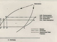 Thermodynamic Considerations - The thermodynamic cycle of most refrigerating systems is shown in Figure 2. Vapor is compressed in process (A - B). Heat is rejected in the condenser on (B - C), with C on the liquid saturation line. The liquid at C is expanded to state D. Heat absorbed from cooled spaces brings the fluid to state A, and the process is repeated. Performance coefficient COP is heat absorbed in D - A referred to compression work in (A - B). In hot ambient conditions the condenser temperature rises, compression work increases and heat absorbed is reduced to (D' - A). If condenser heat rejection increases the process becomes (B - C''), and expands to D". Compression work (A - B) now absorbs heat in (D" - A). With the nominal cycle (A-B-C-D-A), COP = (D - A)/(A - B). With cooling of the condenser COP = (D" - A)/(A - B). Overheated condenser COP = (D' - A)/(A - B). Clearly, small enhancements of heat transfer bring considerable benefits. For Freon 12 and condenser at 110oF COP = 4.6. For condenser at 110oF and 10oF sub-cooling COP = 5.8, an increase of 26%.