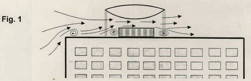 Aerodynamic disks accelerate air flow through roof-mounted heat exchangers to enhance operating efficiency of air conditioning units of tall buildings. Conservative estimates based on wind tunnel tests indicate 26% increase in COP (Coefficient of Performance). Project consulting architect calculated the air conditioning requirements for a 200 ft. high 400,000 ft2 office area building. Using local industrial fabrication and installation estimates, the required 20 ft diameter disk could be sold for $30,000 installed, including overhead and administrative costs. Extremely conservative estimates of $10,000 (probably $15,000-20,000) energy cost savings annually recover the initial expense in 1.5 - 3 years. Disk use by 5% of 3 million U.S. commercial buildings yields both energy cost savings and new industrial-business operations of considerable interest to economy and environment. Project architect found no structural, logistic, legal, or environmental objections to installation of disks on buildings. Fig. 1 shows simplified representation of installed disk.