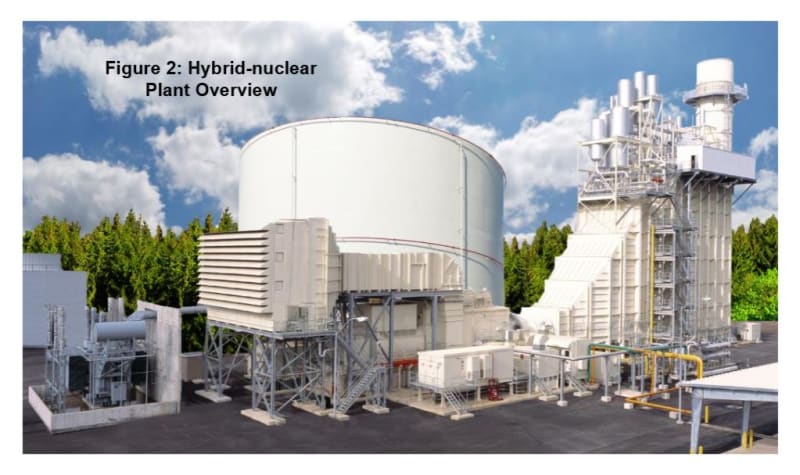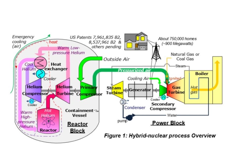 The distinctive hybrid builds on the observation that pressurization of air typically accounts for roughly one-half the fuel used by a gas/combustion turbine. Instead of generating electrical power, the nuclear reactor compresses the air subsequently used by the gas turbine, thereby nearly doubling the gas turbine’s normal electrical output while achieving about a 50% efficiency improvement. The hybrid is the most efficient method for using fossil & nuclear fuels ever created. Figure 2 illustrates a typical hybrid-nuclear power plant.