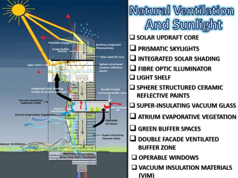 Green Buildings have major potential areas to be tapped through appropriate usage in the design of the building by means of high thermal insulations using insulites, solar shading and VIM technology. Terrace gardening uses atrium evaporative vegetations and green buffer spaces enhancing aesthetic value of building promoting green standards. The use of building integrated photovoltaics and 3-D solar cells can meet the energy requirements of inhabitants in any possible circumstances. Minimization of energy using solar updraft core solves night and low illumination tribulations whereas optofluid switch and fiber optic illuminator with prismatic skylights provides solution for day-lighting.