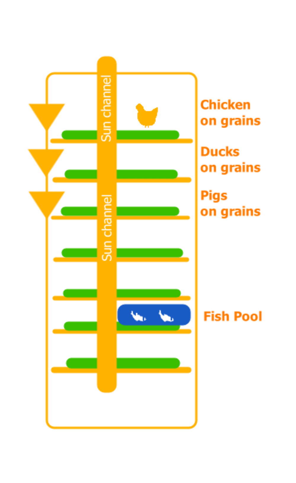 With such a way we will produce the organic grains and the chicken, ducks, pigs and fish in the same house.