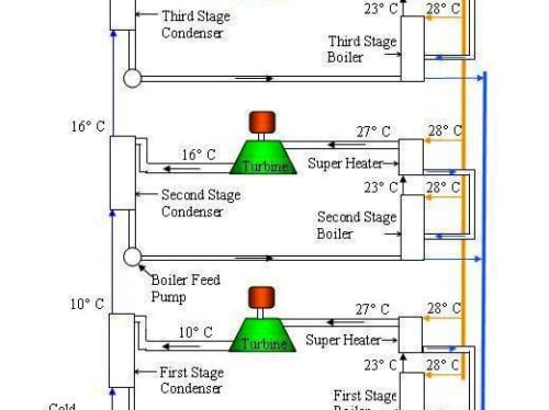 For decades the scientific world has been dreaming of building enough 100 Megawatt OTEC (Ocean Thermal Energy Conversion) power plants to fill the oceans. Why not take the power from the world’s largest solar collector (the ocean)? Near the equator, the warm water provides power to generate electricity, while the deep cold water can condense the working fluid (refrigerant).