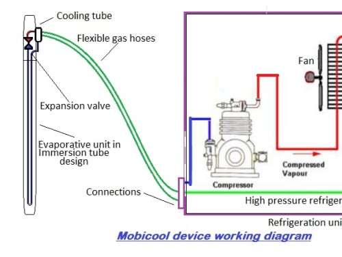 Mobicool liquid cooling device is a mobile cooling unit which contains a compact but power-full refrigeration unit connected with one handy cooling tube via flexible pipes which can cool any liquid by immersing the tube into liquid,