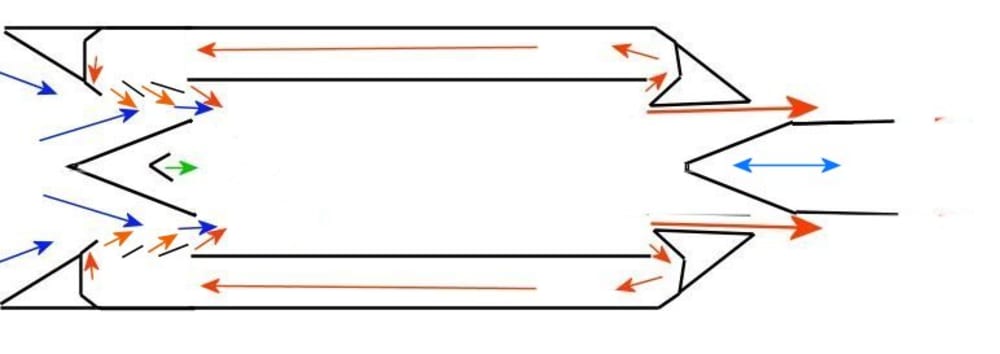 A toroidial vortex is created as the hot gasses circulate to the inlet and this amplifies the inductor flow rates. Stretching the longitudinal axis of the toroid flattens the engine nicely.