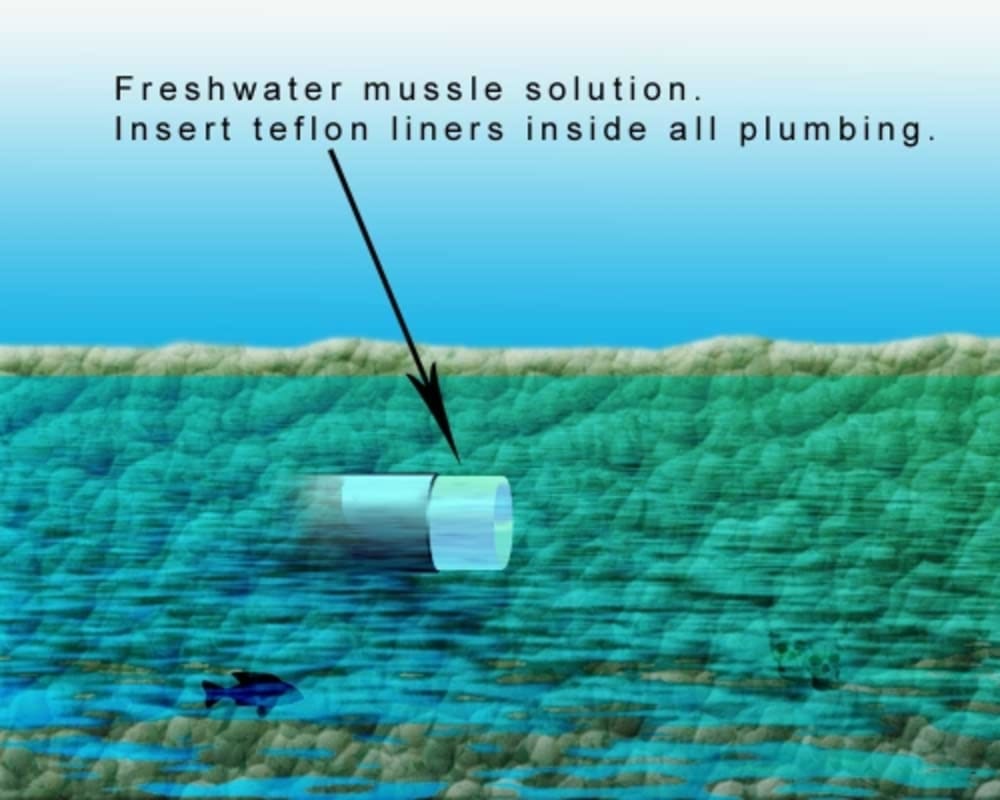 My solution to the zebra mussels clogging up the drainage pipes is to install Teflon or plastic liners, thereby making it difficult for them to attach to said pipes. On Navy ships this would be a great benefit to the various sea chests located on the bottom of every ship. With funding a study can be made to see which plastic works best under various conditions and also allows for chemical changes to be made to the plastic that will not be harmful to other marine life. City and town drainage systems would also benefit.