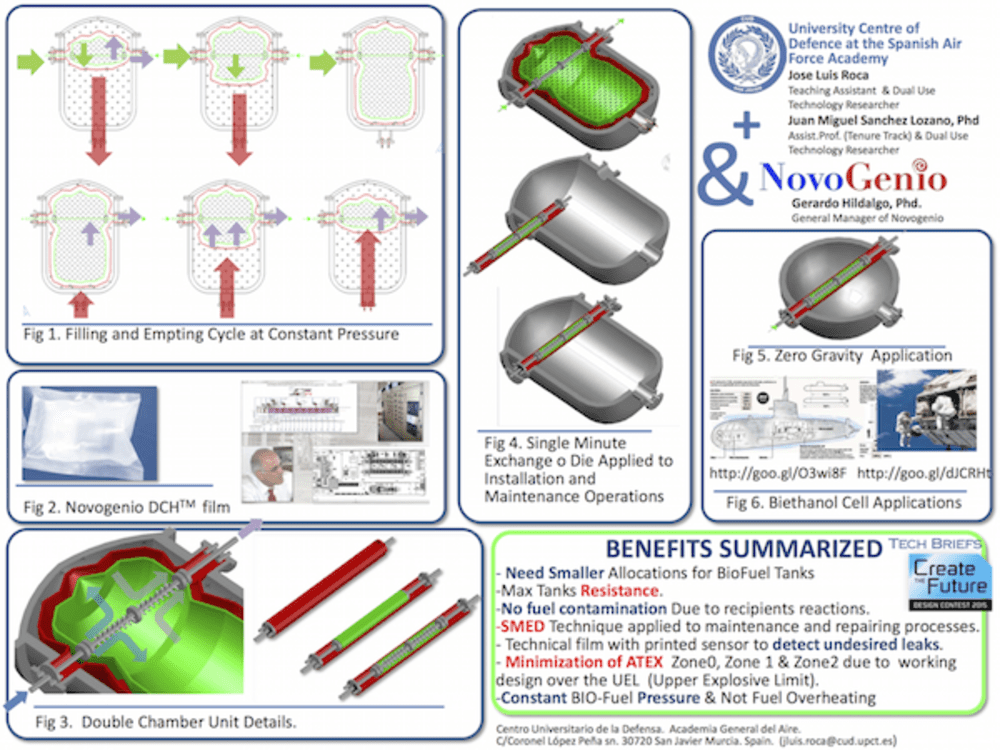 As a matter of fact, bioethanol tanks allocated at industrial areas have enough free space all around to allow comfortable maintenance operations, but when thinking in other types of industrial and defence applications a new design dimension is needed to be developed. As an example what could happen if inside an international space station one of these fuel tanks crack? or what could happen if inside an underwater facility or a submarine there is a need to repair any tank? Therefore the design challenge is to provide a fuel tank that preserve the pure chemicals properties of the fuel contained and be easily removable and installed if necessary as well.