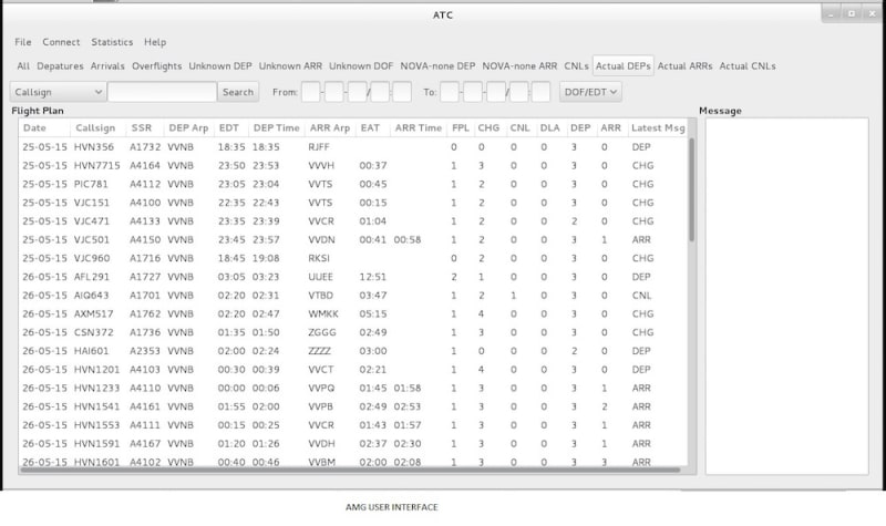 AMG takes the intermediate role between ATM system and ATS message network. It receives message from network, pre-processing, and then feeding them to the ATM system. The processing of AMG consists of exchanging message between ATM system and network, correcting wrong message format, investigating the messages coming for each FPL, taking statistics FPL in concerned categories, and filtering FPLs.