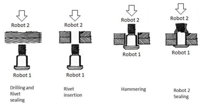The idea is to develop two robots platforms to work in cooperation each one in one side of the jig. The first end-effector is capable to drill, sealing rivet body, positioning rivet at the hole and hammering; at the same time, the second end effector is making opposite force to guarantee no space on the junction of skin and ribs/spars (package); this opposite force and consequently no space avoids burrs going inside package which could cause friction during flight; after the first end-effector finishes its cycle by inserting rivet, the second end-effector applies body sealing on the back side of the same rivet performing the complete cycle: drilling, sealing countersink, rivet insertion, sealing back side rivet – OneStep Assembling;
