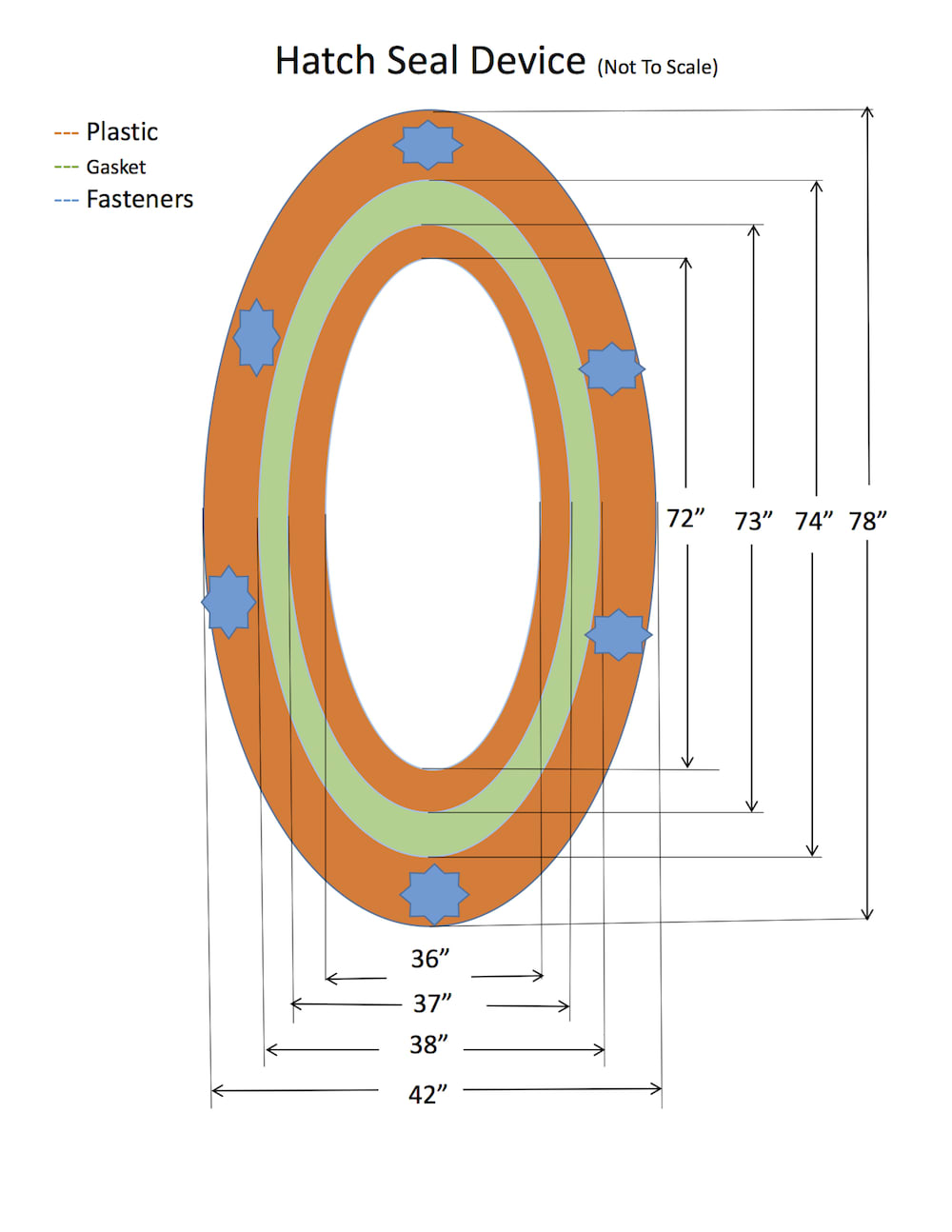 2. 3D print (or injection mold) two each 3.5’ wide X 6.5’ long plastic Sealing Devices to overlap the entrances provided in #1. Design will be optimized by addition of alignment pins, their mating holes and placement of handles to facilitate handling of the plastic Sealing Devices.