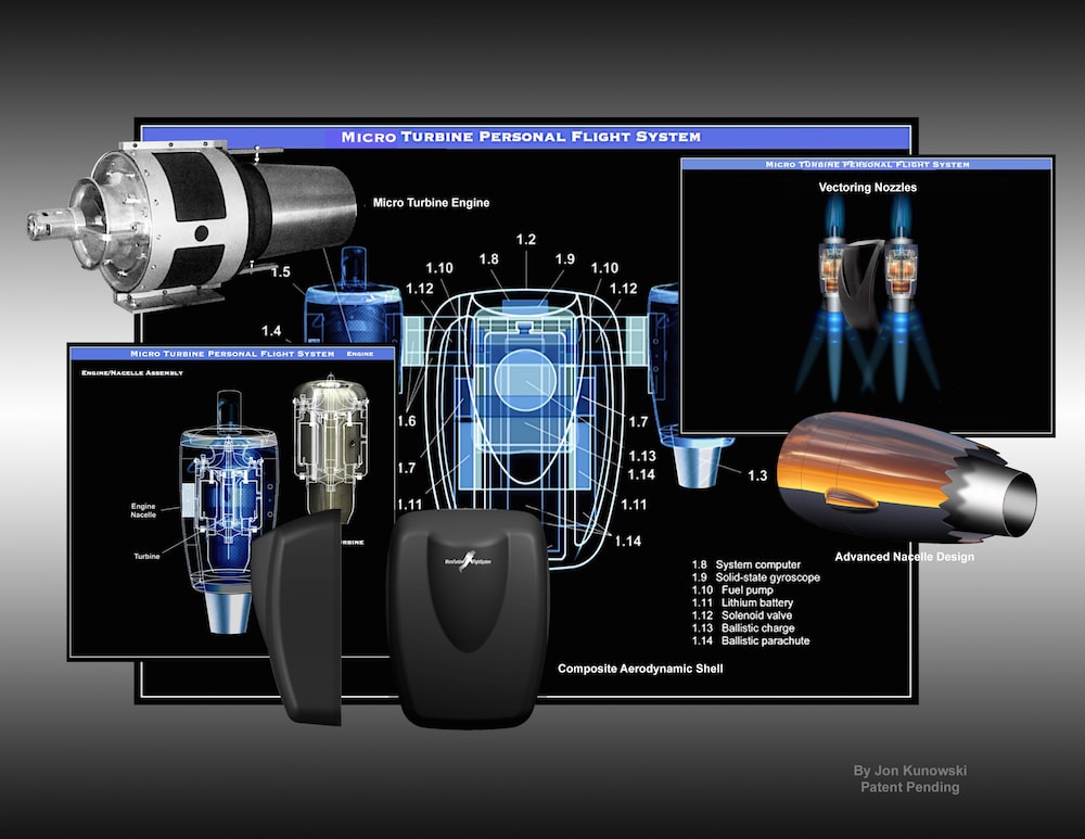 The key components of the flight system are advanced micro-turbojet engines with a weight to thrust ratio with sufficient power to lift a pilot and equipment into the air for unprecedented durations. The engines weigh 22 lbs each and generate over 200 lbs of thrust, for a total of over 400 lbs of thrust in unison. The system includes multiple ECUs, solid-state gyroscopes, accelerometers, system sensors, actuators, solenoids, relays, fuel systems, control electronics, Lithium/Ion/Graphene batteries, programing, contained in an aerodynamic Carbon Fiber/Kevlar/Nomex composite encasement.