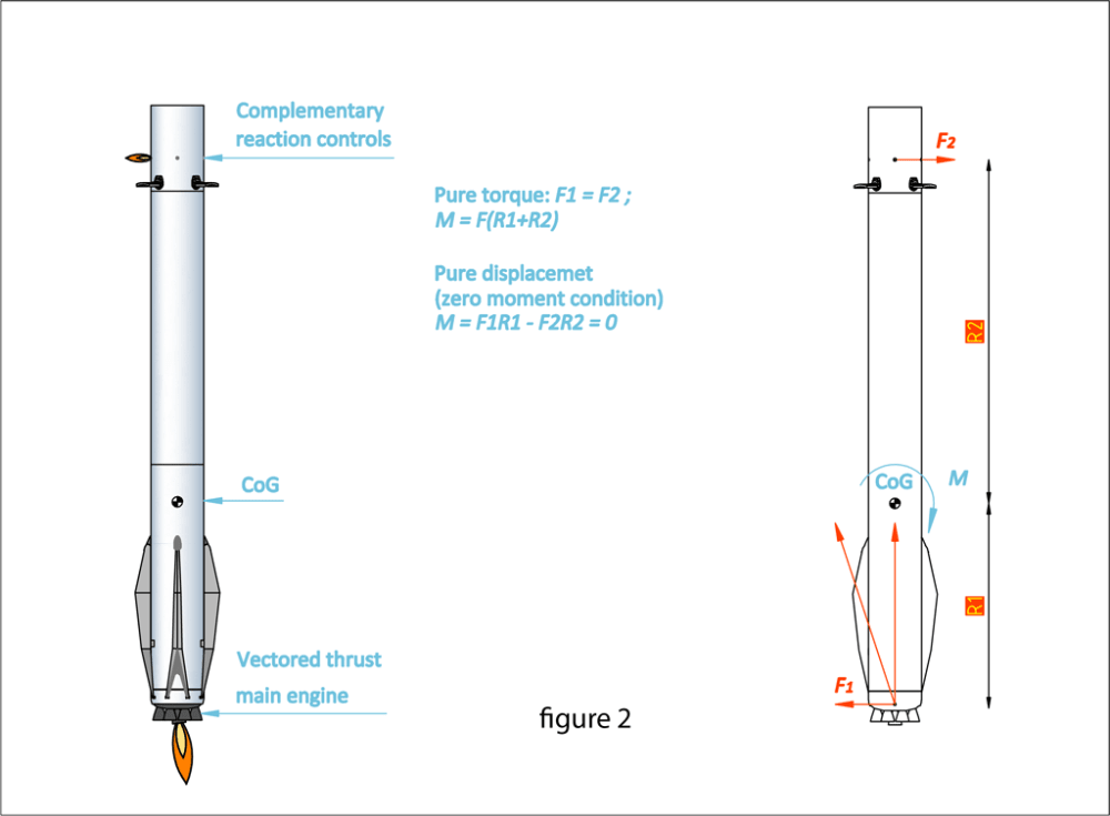 Essential feature of proposed design is the way reaction controls on the top from one side and the vectored thrust on the other side are coordinated. When pure moment has to applied the force inserted by reaction system on top will produce force equal to normal component force produced by vectored thrust. Thus, resulting moment will be M = F(R1+R2), [ref Figure 2]. Pure translation settings may be derived from zero moment condition M = F1R1 – F2R2 = 0 [ref Figure2]. Generally, the normal (lateral) force and rotational moment may be applied simultaneously but independently from each other and from the current angular coordinates of the vehicle.