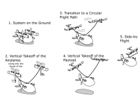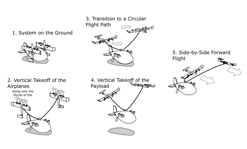 For the takeoff phase (see Figs), the aircraft use solely the thrust of their propellers to overcome gravity in a “tailsitter” configuration. The systems remains compact near the ground since the airplanes are not yet rotating around the payload.