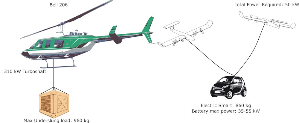Electric conductors are included in the tethers to transfer electric power from the payload to the aircraft. Such architecture allows the airplanes to be light since no energy source is stored on-board and takes advantage of the high power density of electric motors. Moreover, the concept of distributed electric propulsion is used to enhance the performance of the wing in slow speed condition and reduces the noise level to a minimum.