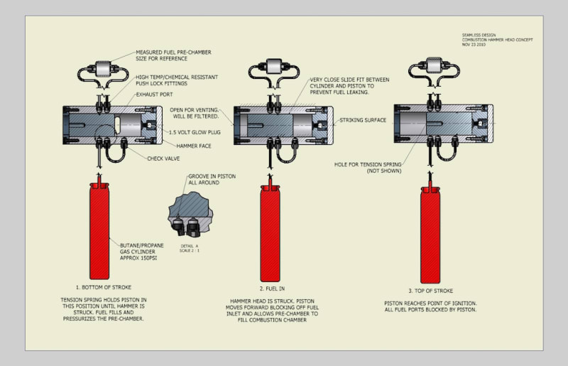 As the hammer impacts the reaction weight moves towards the head compressing the air fuel mixture until compression ignition causes an explosion giving a second equal and opposite reaction force repelling the reaction weight and the hammer head in opposite directions. The result is a doubling of the hammer blow’s force for any given strike. The reaction force lifts the hammer in preparation for the next blow.