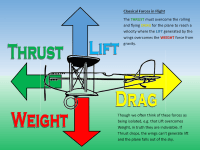 We classically define four fundamental forces for flight: Thrust, Drag, Lift, and Weight, as shown in the figure. This model ties these forces together in an inseparable manner, with each constantly fighting against the other.