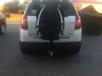 The PramAlong in its up right storage position sits out of the way attached to the tow bar at the back of the vehicle. When you wish to store your pram on the PramAlong simply pull on the yellow handle and the spring loaded ratchet will release then the PramAlong will lower to the ground (under spring tension). If you were to let go of the handle, the ratchet will re-engage holding the PramAlong in that position. Once the PramAlongis lowered all the way to the ground you simply drive your pram onto the pram rest plate where you collapse your pram as per normal. Once the pram has collapsed the rear wheels of the pram will be closest to you and towards the outside of the pram. Clip the pram to the PramAlong and zip the optional weather proof cover. To raise the PramAlong to its vertical storage position simply pull on the yellow handle to release the spring loaded ratchet and raise up until it is in the vertical position. Maintain a 20 cm gap from the rear window of your vehicle to prevent contact.