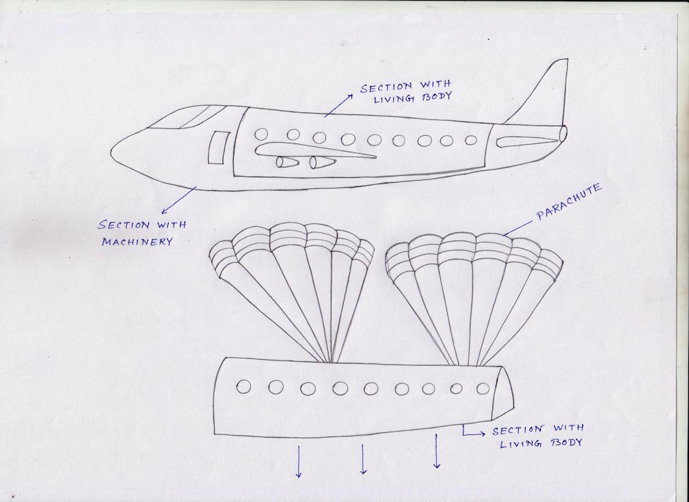 After detachment the living body section would move downward direction and parachute having with this section would be opened according to intervention of computer system at suitable position while moving towards ground or ocean. The section with living body should be leak proof so that it can float if it drops on water.