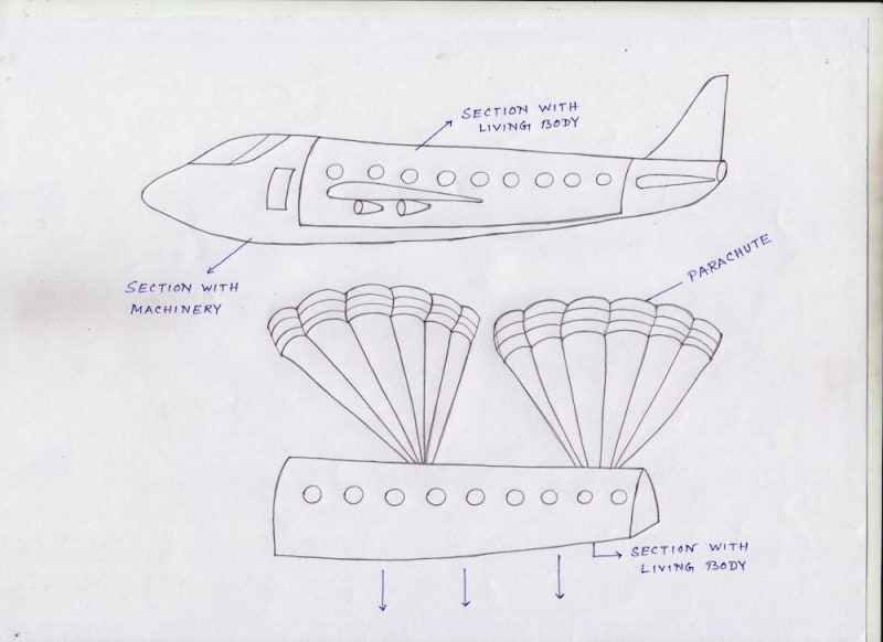 My idea is to design an aircraft in such a way that it can reduce passenger’s life risk. Let me explain. HUMAN LIFE DEFENDABLE AIRCRAFT would have two major sections. One is section with machinery including engines and another is section with living body (i.e. with Passenger and aircraft staff). In the figure you can see that the section with living body of the aircraft is attached in such a technique with the section with machinery that enables the section with living body easily detachable. If section with machinery faces any fatal defect that can’t be recovered during flight then automatically or according to pilot’s decision (manual) the aircraft’s section with living body will be detached from the section with machinery. The automatic and manual detaching mechanism is handled by a smart computer system which is responsible for real time observation of whole machinery section and also can have power to take decision for accurate action to save life of passengers and aircraft staff.