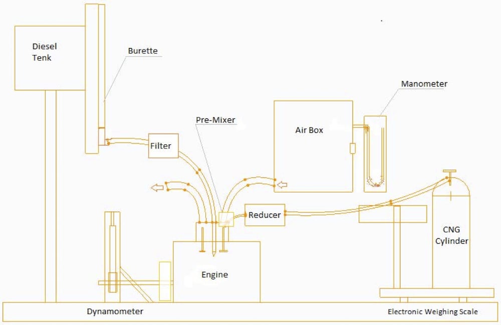 Dual Fuel Engine as the name suggests runs on two fuels i.e. diesel and CNG. The air and CNG is mixed in a pre-mixer and injected into the inlet manifold during the suction stroke. Before the piston reaches from BDC to TDC, pilot fuel (diesel) is injected in the cylinder which auto-ignites due to high pressure and temperature inside the cylinder and burns the mixture of air-CNG and combustion occurs. The dual fuel operation does not involve any major engine modification, only a pre-mixer is attached on the inlet manifold. In dual fuel engines, at low loads when the gaseous fuel concentration is low, ignition delay period of the pilot fuel increases and some of the homogeneously dispersed gaseous fuel remains unburned and results in poor performance. A concentrated ignition source is needed for the combustion of the induced fuel at low loads. Further the injection timing of the pilot fuel, injector opening pressure, pilot fuel quantity and intake temperature are some of the important variables controlling the performance of dual fuel engines at high loads. This process has the advantage of instant switchover to diesel-only operation, in case natural gas is unavailable. The degree of diesel replacement by natural gas depends on - the engine operating conditions and the engine design to some extent, typically varying from 60% to 70%. The dual fuel technology has been much more successfully used in engines with less variation of load, where the engine speed varies in a small range. The use of diesel fuel allows the retention of the diesel compression ratio and its efficiency while the natural gas contributes to economy and is responsible for lower and eco-friendly emissions.