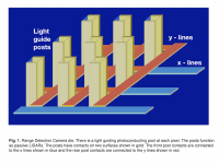 This ranging system uses broad band ambient light. The various light frequency components are only coherent in spherical light packets one coherence length thick. Each frequency component in the light packet acquires a phase proportional to the distance the light packet traveled. Each frequency component produces a pattern in the light guide post. The light patterns shift in response to the phase of the incoming light. The photocurrent at each point in a light guiding post is proportional to the light intensity at this point. The contacts sum the total photocurrent in each post. The light intensity is proportional to the product of the light electric and magnetic fields. Both the electric and magnetic fields of the broad band light have components oscillating at many different frequencies. The product of two waves oscillating at different frequencies is equal to the sum of a wave oscillating at the difference frequency and a wave oscillating at the sum frequency. The sum frequency waves are in the UV and are not detected. The difference frequencies range from zero to light frequencies. Though the photo current detecting electronics can detect at most radio frequencies.