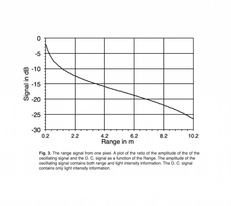 Each LIDAR post produces a D. C. electrical signal that has only light intensity information and an oscillating electrical signal. The amplitude of the oscillating signal has both light intensity and range information. The oscillating signal is noise like, since it is derived by an autoheterodyne mechanism from broadband partially coherent ambient light. An example of the ratio of the amplitude of the oscillating signal and the D. C. signal as a function of range for one pixel is shown in Fig. 3.