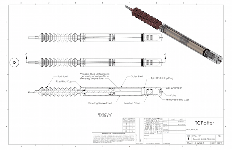 This is accomplished by having a simple sleeve made from a flat sheet. The sheet is rolled to form a split tube. The ends of the sheet forming the gap of the tube are trimmed with the appropriate geometry then simply rolled and inserted into the outer shell of the shock absorber. This now forms the inner cylinder of the shock absorber. The piston & rod are then assembled and inserted. The shock absorber is filled with the appropriate fluid, the end cap is tightened in place and the unit is charged with an inert gas. The unit is easily repairable.