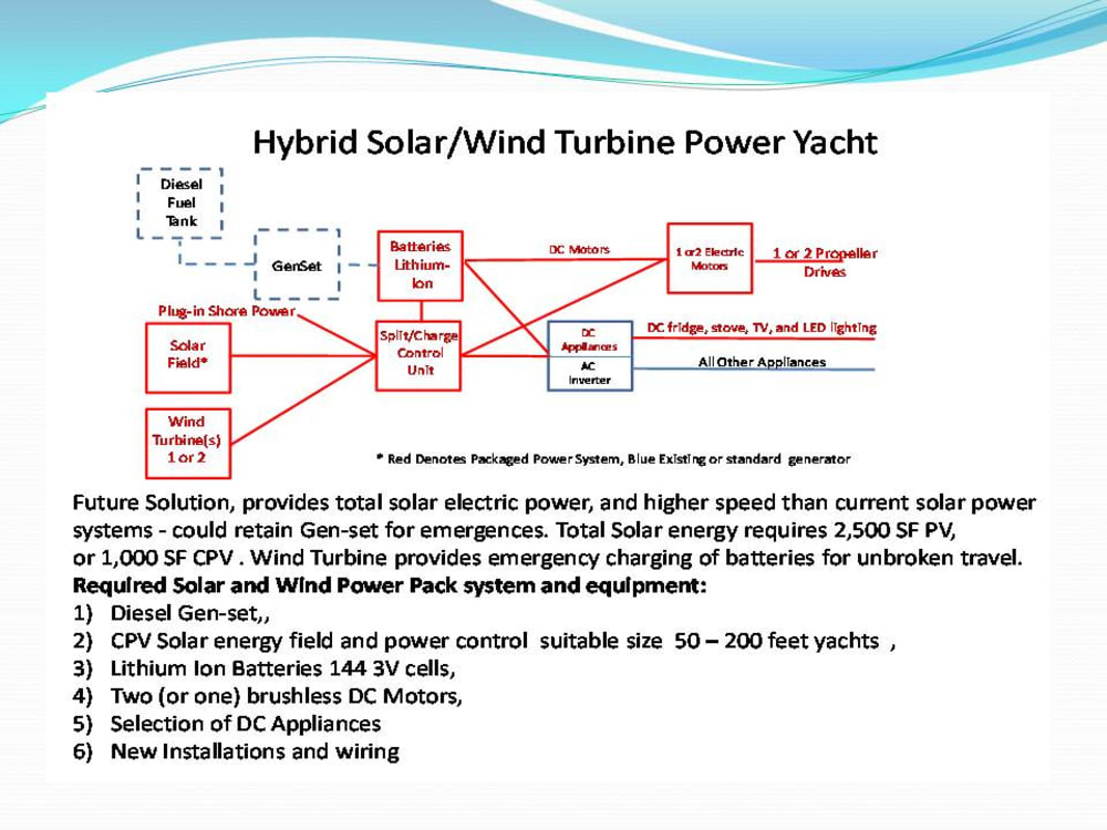 An 80 foot planned prototype Hybrid Solar Vessel integrated with the above listed technologies can operate with a 1,700SF CPV solar energy field at double the speed of Planet Solar (5,839SF at 3.5kns); and wind turbine that will meet the onboard Hotel Load and augment battery charging satisfying commercial requirements. Three years of solar field power developments has now made it possible to consider reasonable perpetual mobility and sustainment on water at zero cost for use in vessels from 80 to 300 feet. By integrating all energy collection into a complete overarching system, it will have a cascading downward impact on the availability of power for mobility and sustainment. For the foreseeable future, the Hybrid Solar Vessels up to 300 feet can be totally independent of fossil fuel in perpetuity and at the same time lessen impact on the environment.