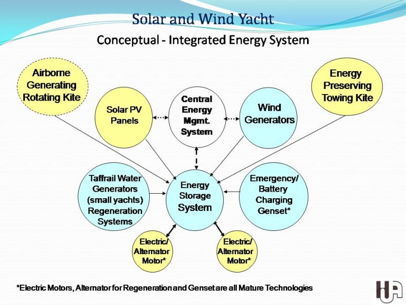 The new HJA Solution PowerPack architecture illustrates a range of element of renewable energy options for a Hybrid Solar Vessel that will make it totally independent of fossil fuel for travel at meaningful speeds. By using CPV solar as the main power source it makes it possible to substantially reduce the solar field and correspondingly the sizes of any vessel - allowing for more energy for larger vessels as well as introducing opportunities to retrofit existing vessels – by the application of the following new technologies: