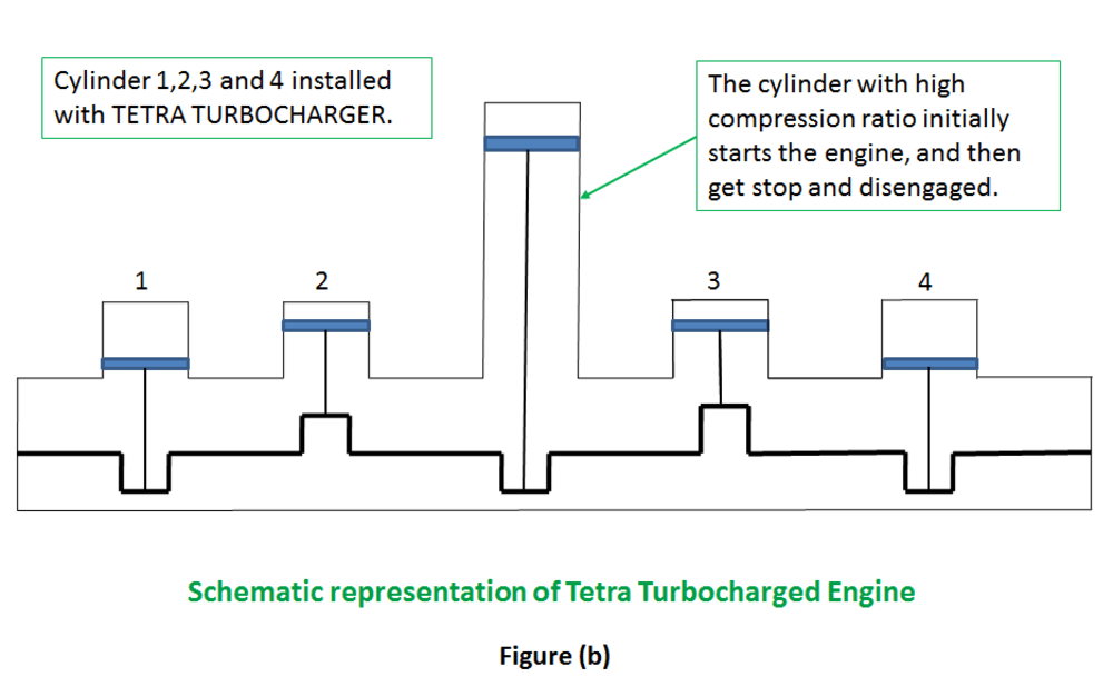 For sake of study 5 cylinder engine is taken, one with high compression ratio cylinder will solve the problem of starting. After starting the engine it will get stop or disengage (or in heavy vehicle with some modification can be used as air compressor), the system will now run on the four small cylinder equipped with tetra turbocharger and will able to utilize the maximum fuel energy with high power.