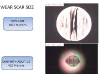 Since there are no carbon-carbon double bonds, the DME combustion process produces virtually no soot (particulate matter) or nitrogen oxides (NOx), the bane of any Diesel engine. In current Diesel engines, the fuel itself acts as a lubricant, protecting the fuel injector and other system components from excessive wear. Diesel fuel lubricity additives are required and standard tests have been developed to determine a fuel’s "lubricity", or its wear protection ability. The standard tests involve reciprocating a loaded ball and disc immersed in the fluid for a specified period of time. At the end of the test a wear scar is measured. The lower the wear scar, the better the fuels lubricity.