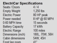 The vehicle has a fiberglass skin over a steel frame and weighs 1250 lbs. It drives 100 miles on battery and at speeds up to 85 mph. For trips greater than 100 miles, batteries are charged enroute by a small gasoline-powered generator.